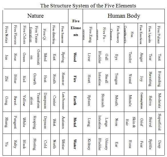 Five elements refers to the movement and transformation of the five categories of things in the natural world, there are wood, fire, earth, metal and water. The theory of five elements holds that all things on the natural world are derived from wood, fire, earth, metal and water. So they all bear the basic properties of these five elements and maintain a harmonious balance through the activities of constant inter-promotion and inter-restraint among the five elements. The relationship among the five elements can be illustrated in the following table: