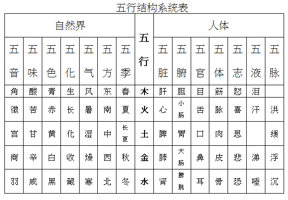 五行,是指自然界中的木、火、土、金、水这五种物质的运动变化和其相互之间的关系。五行学说认为,世界上一切事物都是由木、火、土、金、水这五种物质所衍化生成,都具有五行的基本特性,并且在不断地相互资生,相互制约的运动变化中维持着整体的协调与平衡。各种事物之间的相互关系可用以下的“五行结构系统表”来加以说明